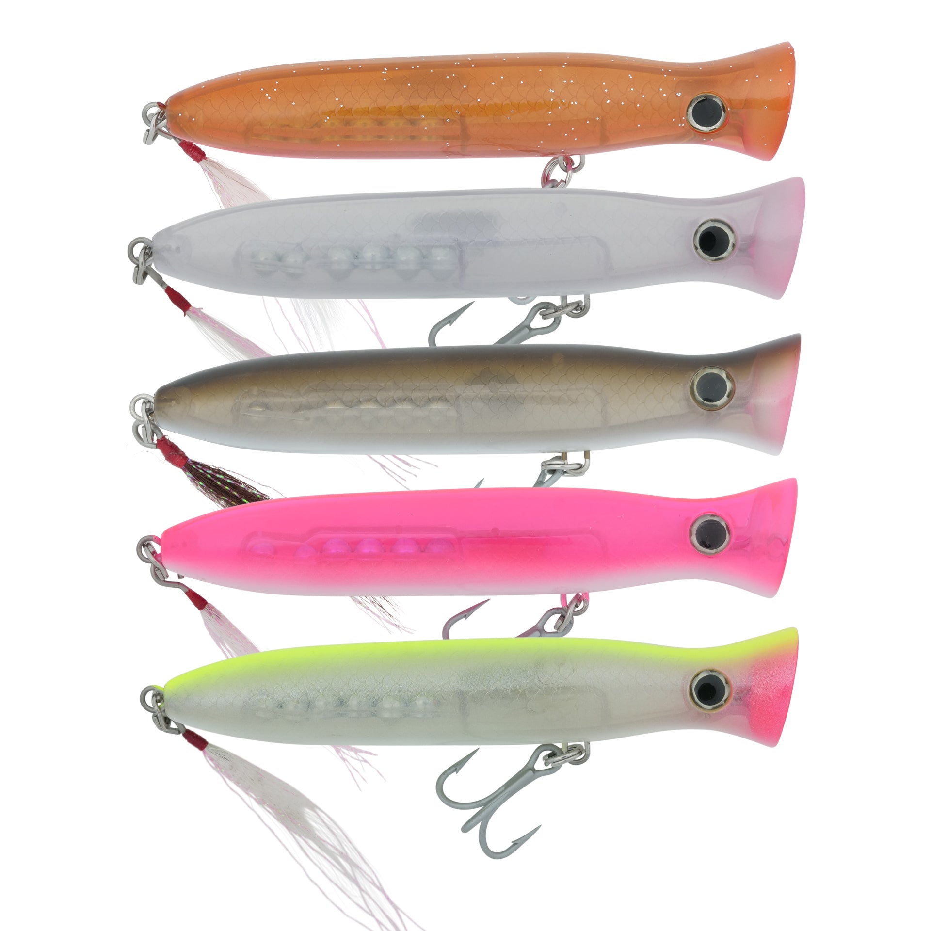 - V-belly track: Keeps the plug stable in current seams and surf, making both chugging and walking retrieves clean and controlled.