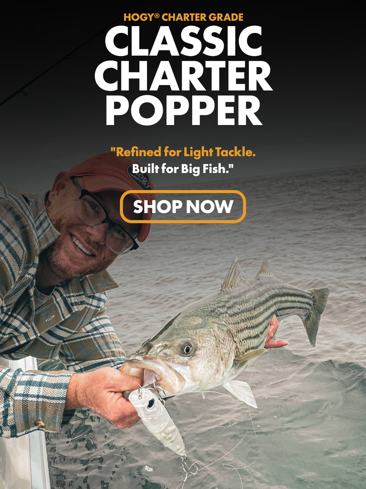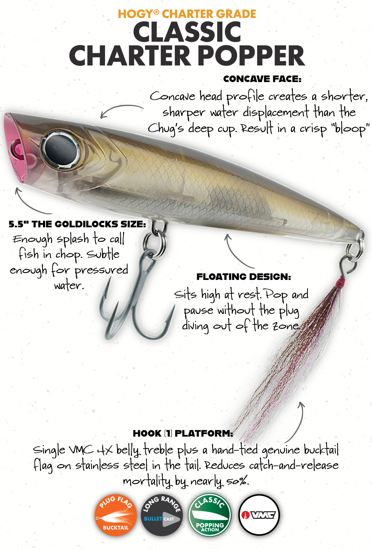 The Classic Popper is the most versatile topwater in the Hogy system. It’s the plug Capt. Mike reaches for first when conditions are variable, when he doesn’t know what the fish want, and when he needs an answer fast. A concave face throws a crisp, sharp bloop that cuts through chop and silence alike — calling fish up from structure, locating scattered feeders, and forcing a reaction from bass that weren’t actively hunting.