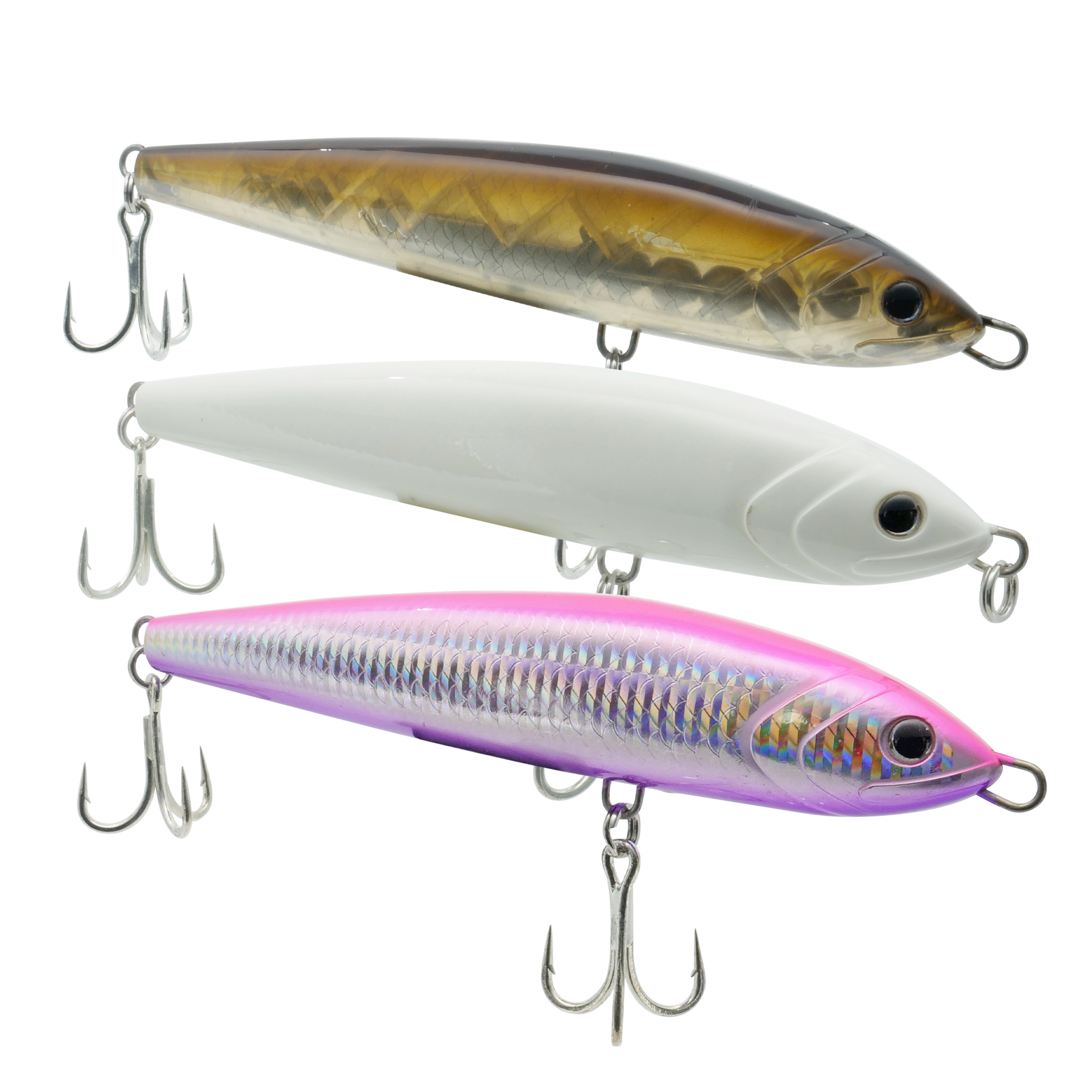 - V-belly track: Keeps the plug stable in current seams and surf, making both chugging and walking retrieves clean and controlled.