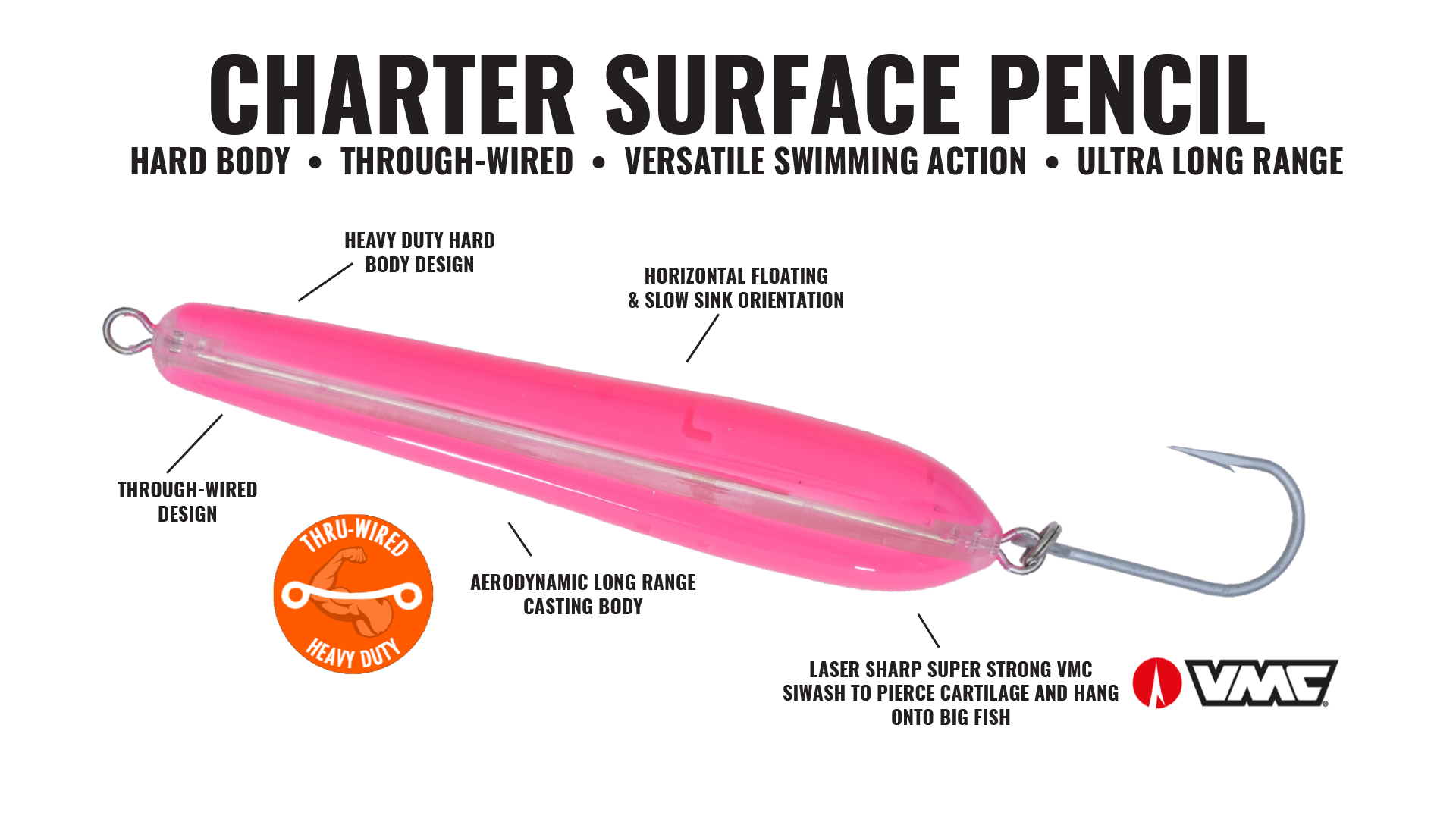 Introducing the new Charter Grade Surface Pencil: These simple, effective surface plugs are designed for ultra-durable, long range, trophy surface action. These versatile plugs can be retrieved using multiple methods for side to side swimming action, quick fleeing / darting movement, or erratic surface splashing action.
